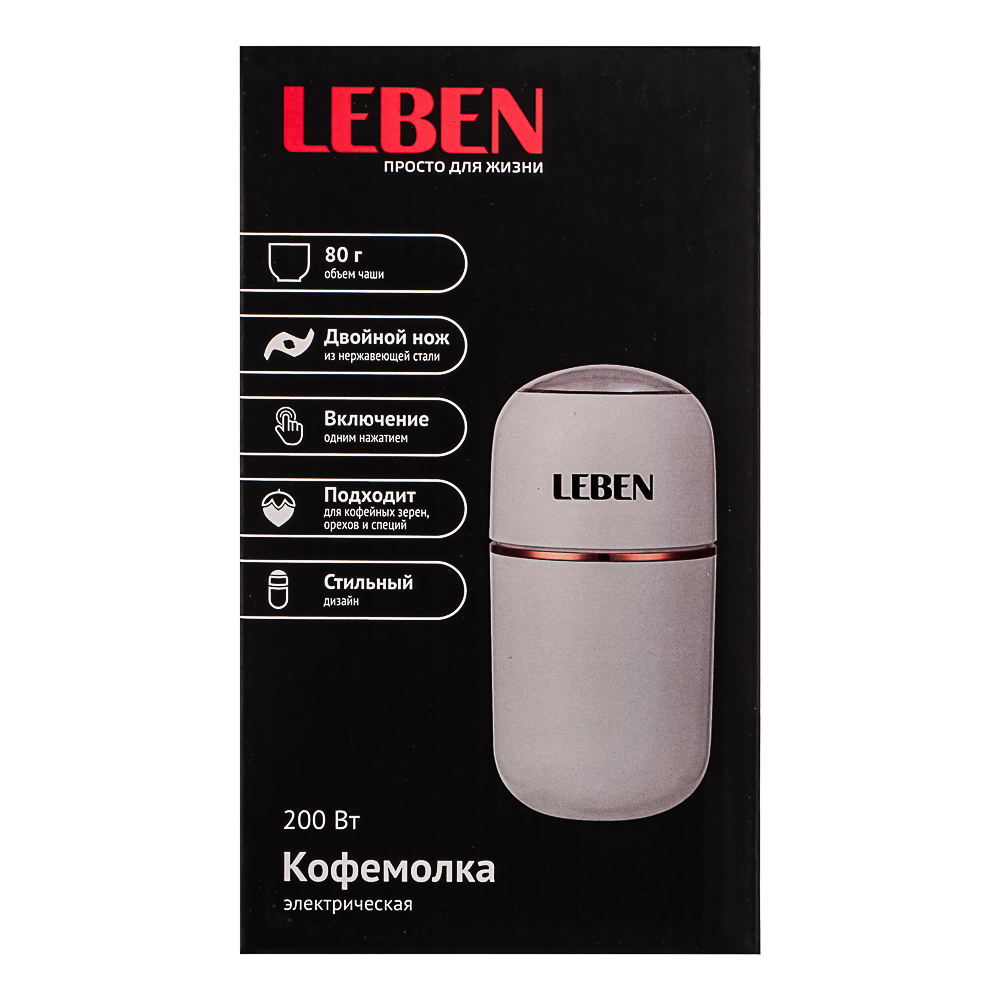 Кофемолка Leben позволяет наслаждаться вкусным кофе из свежемолотых зерен. Лезвия из нержавеющей стали быстро и аккуратно измельчают кофейные зерна. Система защиты исключает включение прибора при снятой крышке в целях вашей безопасности. Кофемолка Leben вмещает 50 грамм продукта. Гигиеничный материал не скользит в руках и обладает повышенной износоустойчивостью.