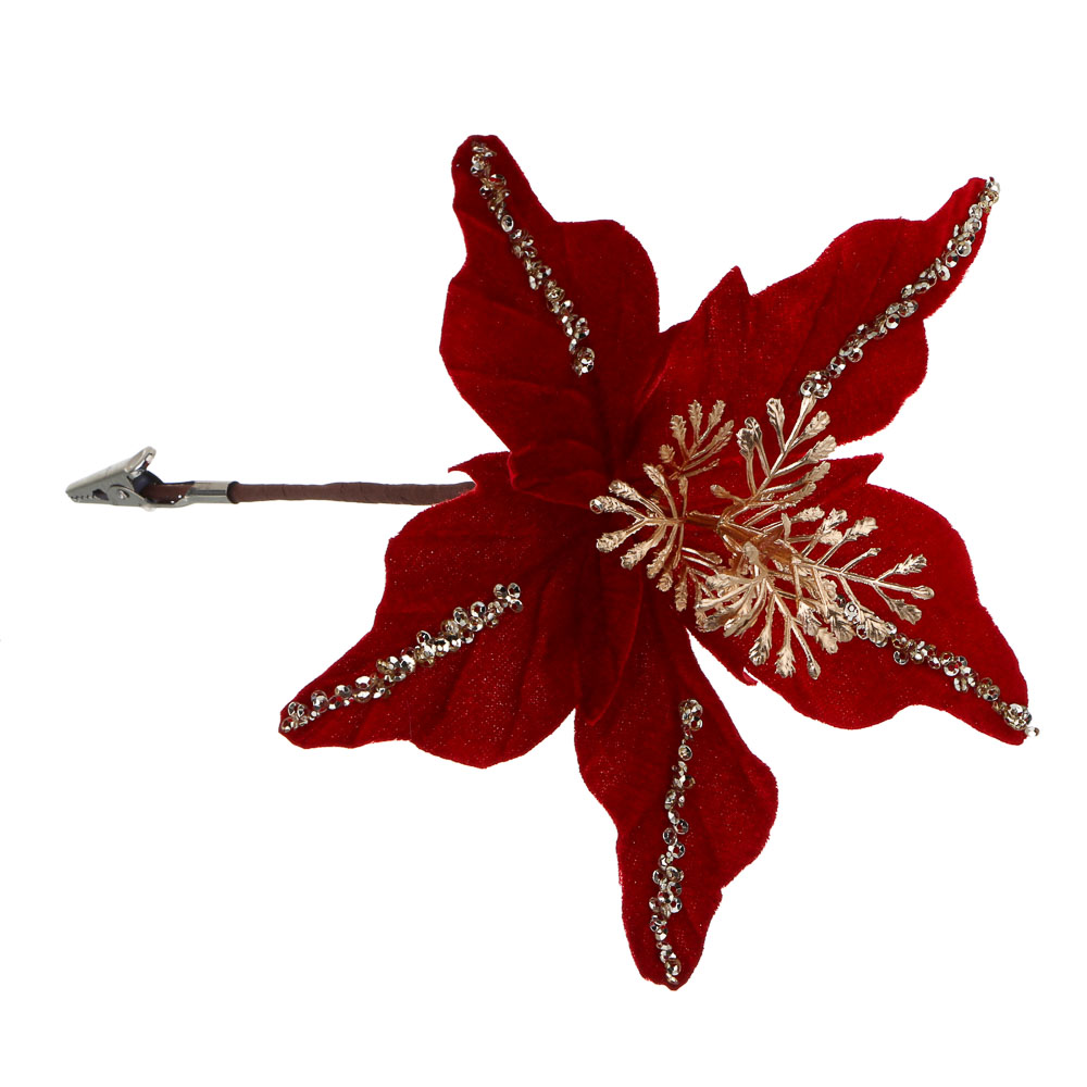 СНОУ БУМ Пуансетия 15 см на прищепке (5 лепестков), глиттер, полиэстер, металл, 26-417