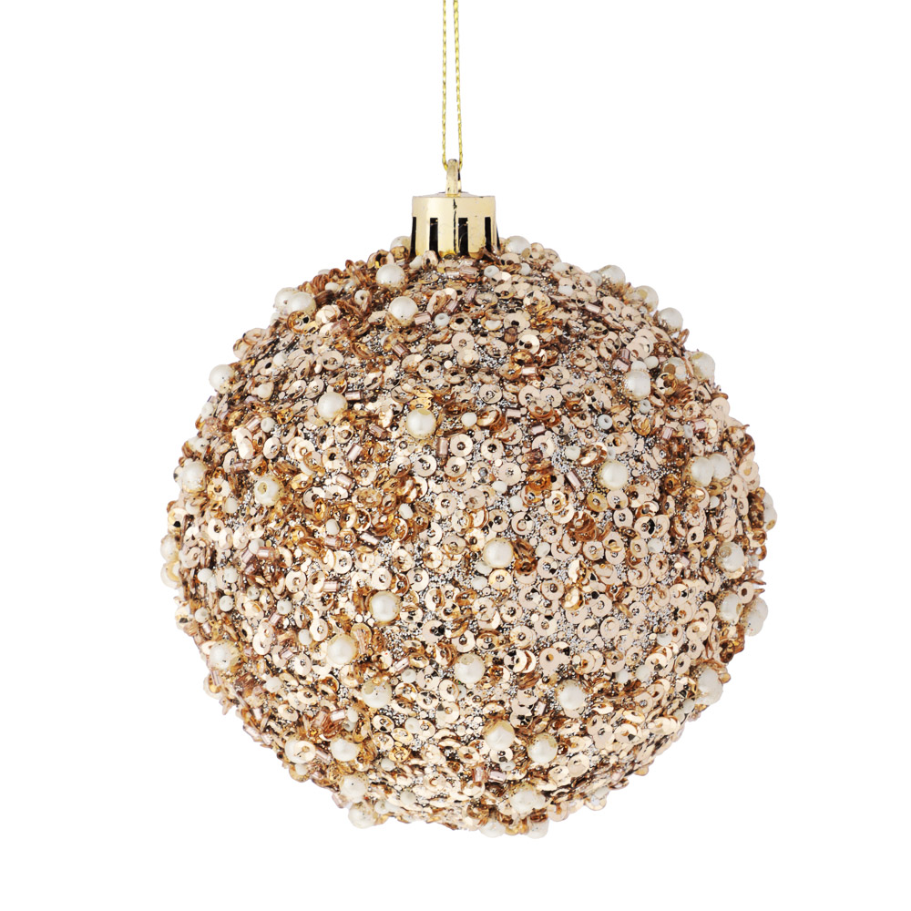 Елочный шар СНОУ БУМ диаметром 8 см в цвете шампань – это стильная новогодняя игрушка для украшения елки. Подвеска с декором из бисера и пайеток смотрится необычно и изысканно, органично вписываясь в окружающий интерьер. Изделие из пластика не боится повреждений, покрытие не осыпается, поэтому оно сохранит первоначальный вид в течение многих лет.