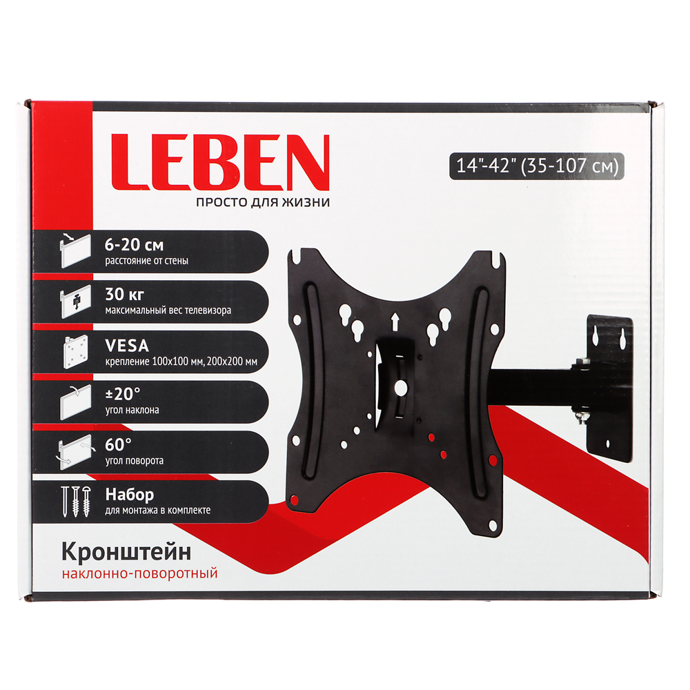 LEBEN Кронштейн для ТВ наклонно-поворотный, 14"-42", до 30кг, 100x100 до 200x200мм, мет