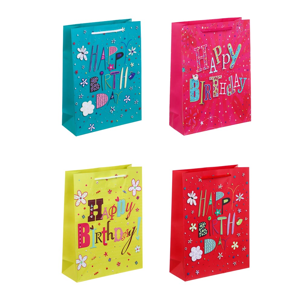 Пакет подарочный бумажный, M 18x24x7 см, 128 гр, 4 дизайна, С Днем Рождения