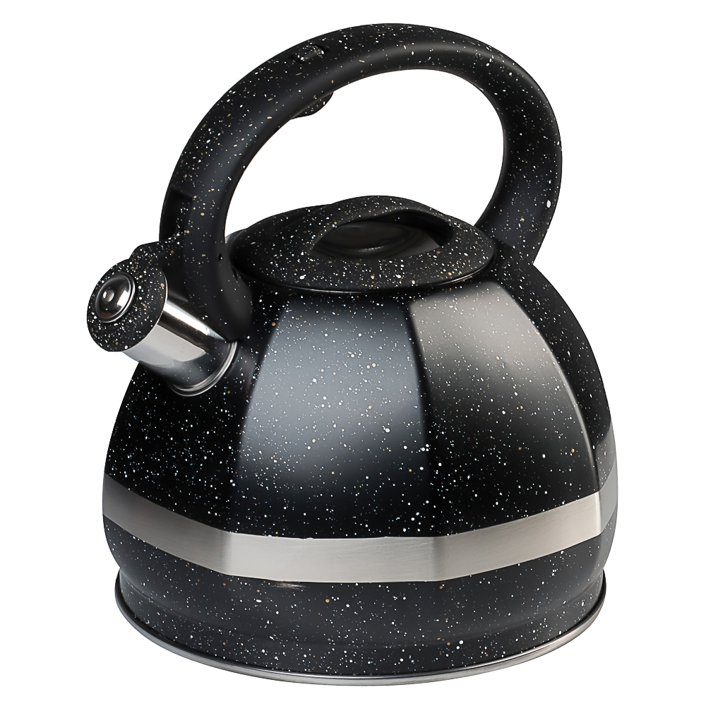 Стальной чайник VETTA "Мартино", объем 2,9 л из нержавеющей стали займет достойное место на домашней кухне. Имеет стильный дизайн с покрытием «под камень» и практичный строгий черный цвет, который гармонично впишется в интерьер современной кухни. Идеально ровное капсульное дно обеспечивает максимальный контакт с конфоркой, равномерно нагревается и долго сохраняет тепло после закипания воды. Бакелитовая ручка не нагревается и не скользит в руке. Свисток комфортно фиксируется в открытом положении. Чайник легко моется и сохраняет первоначальный вид в течение всего срока эксплуатации. Подходит для всех типов плит, включая индукционные.