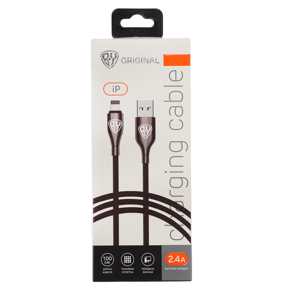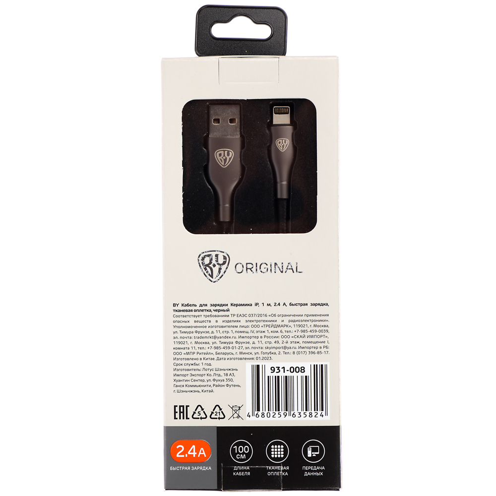 BY Кабель для зарядки Керамика iP, 1м, 2.4А, Быстрая зарядка, тканевая оплётка, черный